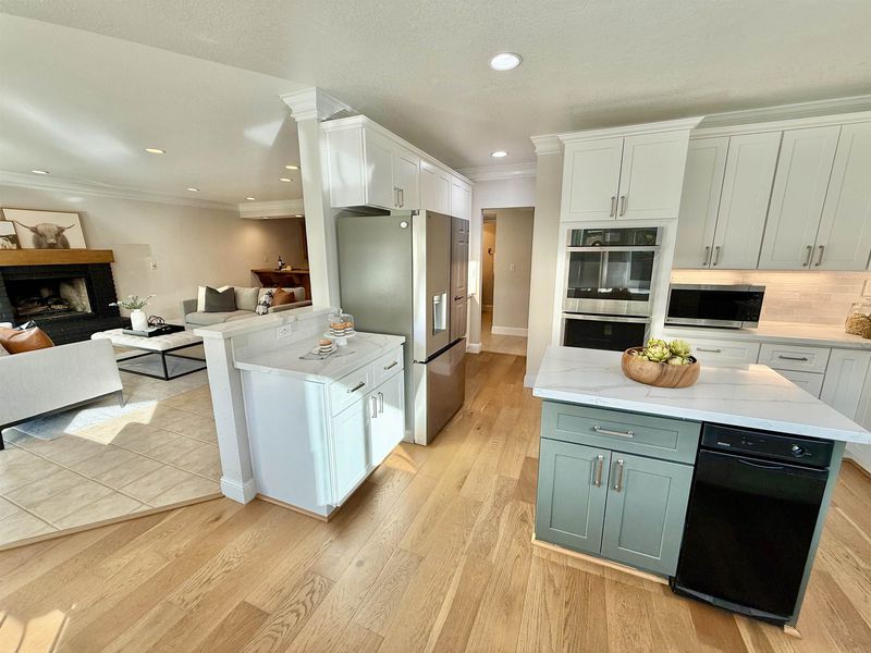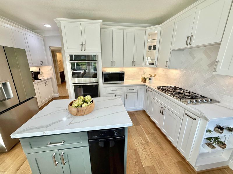 - Dishwasher, Double Oven, Gas Range, Microwave, Refrigerator, Trash Compactor, Gas Water Heater, Counter - Solid Surface, Eat-in Kitchen, Disposal, Gas Range/Cooktop, Kitchen Island, Updated Kitchen