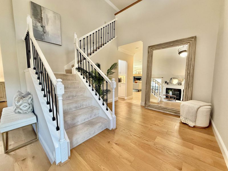 Gorgeous home in the highly desirable gated Canyon Lakes community with a phenomenal location! From the moment you arrive, you’ll be impressed by the beautiful curb appeal and low-maintenance front yard, all within a private gated neighborhood. Step inside to rich engineered hardwood floors leading through the formal living and dining rooms, highlighted by soaring vaulted ceilings and a cozy fireplace. The spacious family room is ideal for entertaining and features a unique custom bar, creating the perfect gathering space. The fully updated kitchen offers stunning quartz countertops, crisp white cabinetry, stainless steel appliances, and picturesque views of the backyard, sparkling pool, and open space beyond. Upstairs you’ll find four generously sized bedrooms, including a luxurious primary suite with a walk-in closet and spacious bathroom. The updated hall bathroom showcases modern finishes. Relax and entertain in the private backyard with low-maintenance landscaping, outdoor BBQ island, and resort-style pool backing to open space for added privacy. Additional highlights include a three-car garage with extra storage, solar for the pool and home, and numerous upgrades throughout. Minutes to shopping, dining, walking trails, and entertainment. This is the home for you!