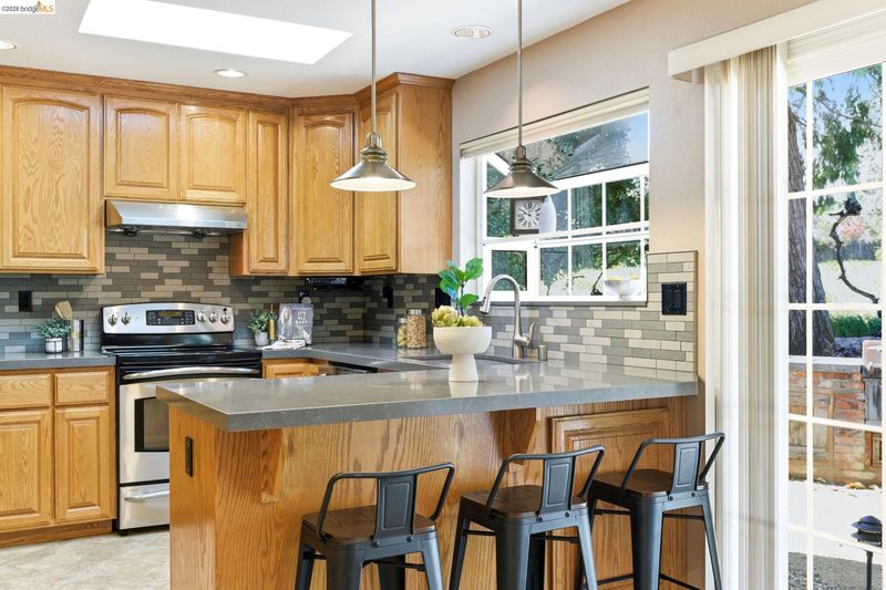 Dishwasher, Electric Range, Microwave, Gas Water Heater, Breakfast Bar, Stone Counters, Eat-in Kitchen, Electric Range/Cooktop, Pantry, Skylight(s), Updated Kitchen
