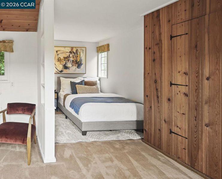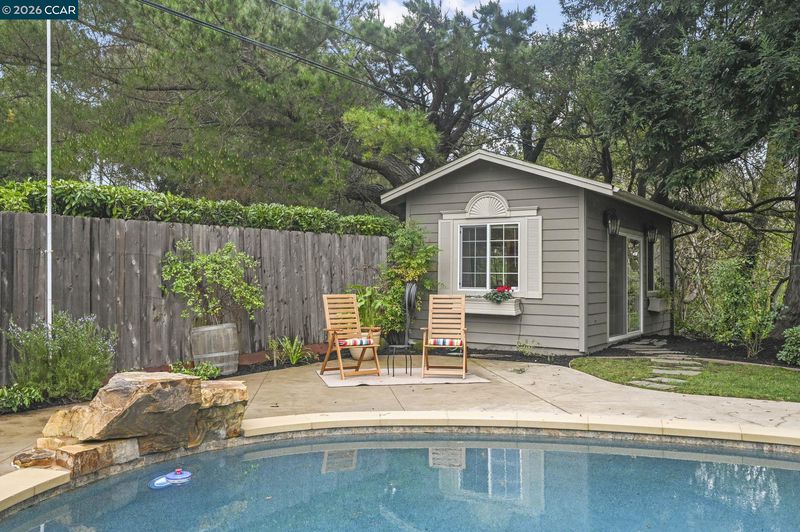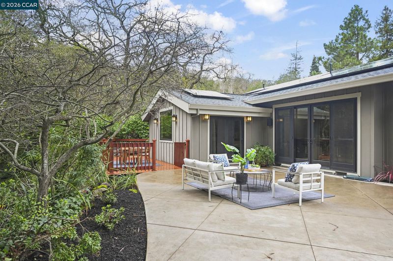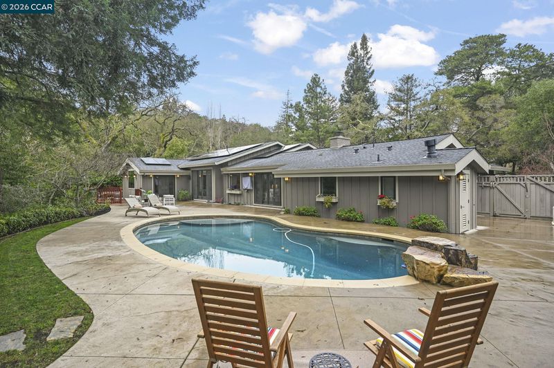 Set in the beloved Burton Valley–Trails neighborhood, this rare gem .86-acre retreat offers a peaceful escape just steps from the Lafayette-Moraga Trail and a stroll or bike ride to Lafayette’s highly acclaimed elementary, middle, and high schools. Fully remodeled in 2017, this turnkey, custom-built home blends comfort, function, and refined design. The heart of the home is a chef’s kitchen with Wolf appliances, quartzite counters, and generous workspace, opening seamlessly to the main living areas. A spacious formal dining room with fireplace and bar is ideal for entertaining, while high ceilings, custom built-ins, designer-chosen paint colors, and engineered wood and tile floors throughout create a timeless, elevated feel. The primary suite features a walk-in closet, custom cabinetry, spacious shower, & direct access to a private sparkling hot tub. 3rd bedroom currently serves as an executive office with Murphy bed, built-in desk, and extensive cabinetry. Outdoors, enjoy a private sanctuary with views of mature oak trees and soaring redwoods, pebble-bottom pool. Add'l amenities: owned solar, whole-home generator, Enjoy detached gym with mirrored wall and separate HVAC. Guests in charming cottage drift off to the soothing sound of the creek—all at the end of private court.