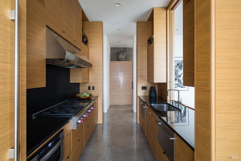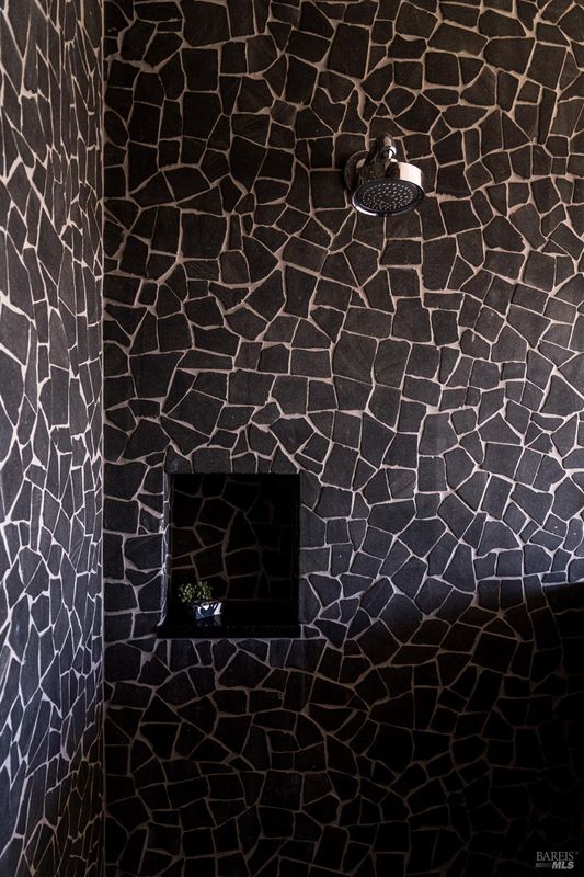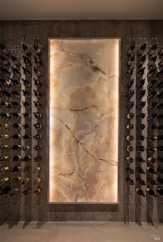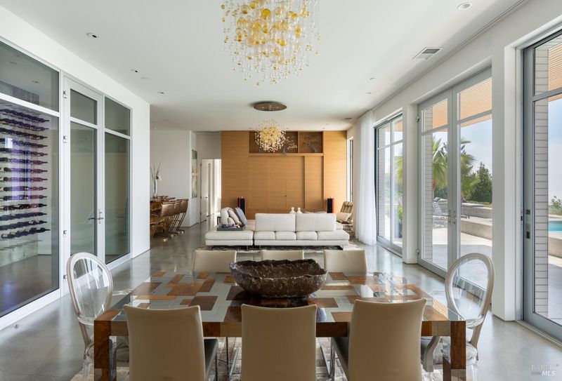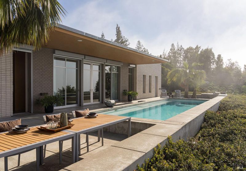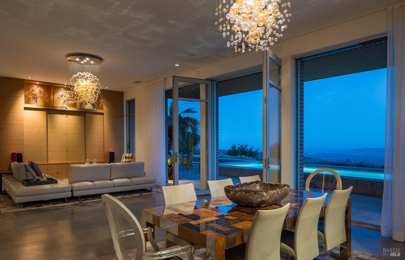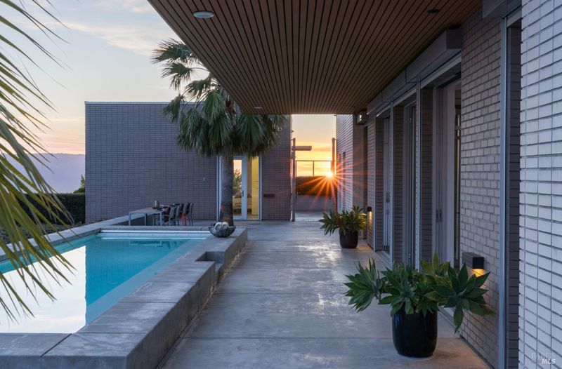 Designed by Portico West, and influenced by Philip Johnson's Glass House, 2947 Cavedale Road is a remarkable property. Built into the hillside, with views of the San Francisco skyline and the iconic Valley of the Moon, you're surrounded by a breathtaking landscape. The security gate to enter the property is made up of corrugated steel panels, and is the first introduction to its modern and industrial aesthetic. The interior of the home features an abundance of creative design elements, including custom teak cabinetry, handblown glass chandeliers, and a wine room with a backlit onyx wall. There are two spacious suites, each with separate entries for added privacy. A private guest house is located near the entry doors to the patio. Separating the patio from the inside of the home are custom ten foot doors, which slide into a hidden wall to allow for a complete open. The outdoor space boasts a built-in pool with bench seating around the perimeter, a bocce court, and mature landscaping.