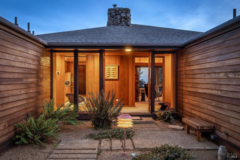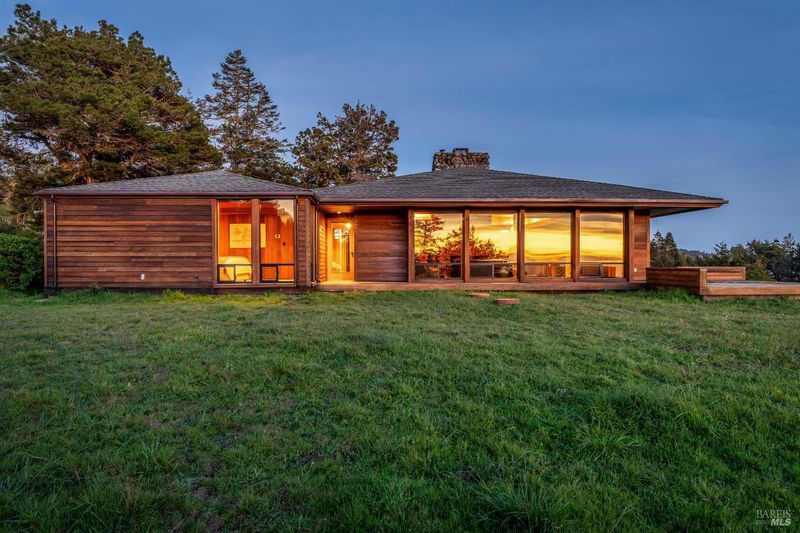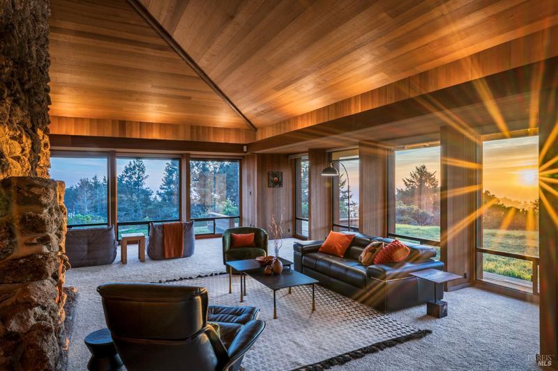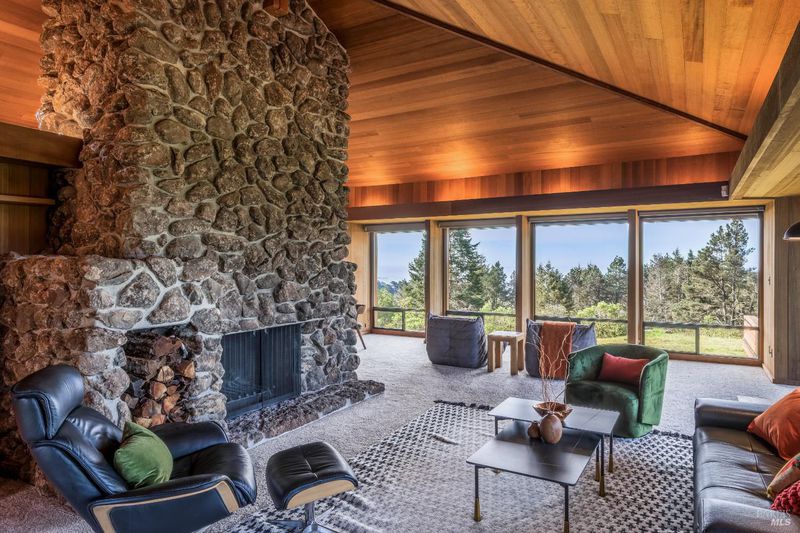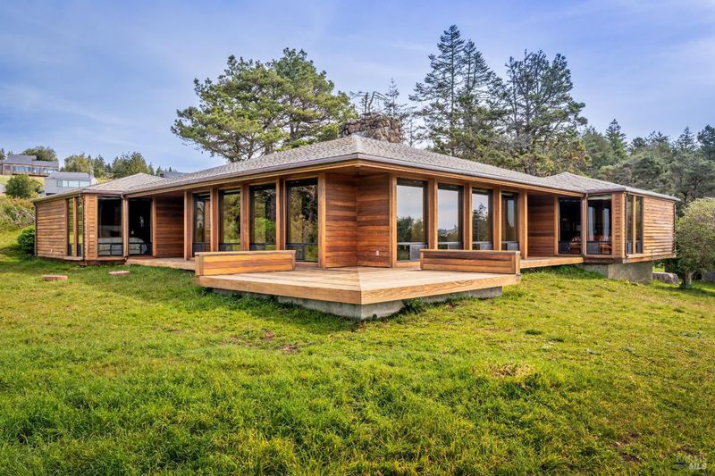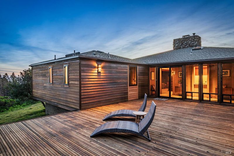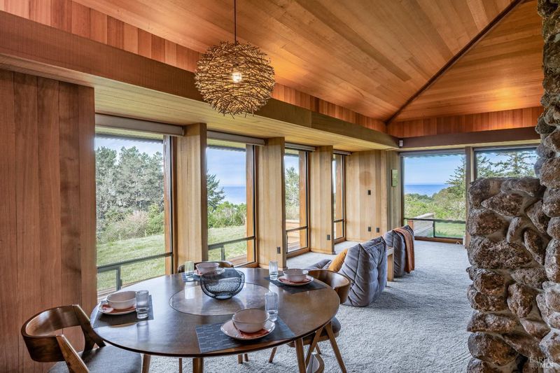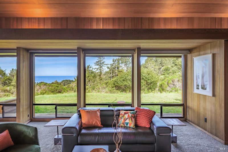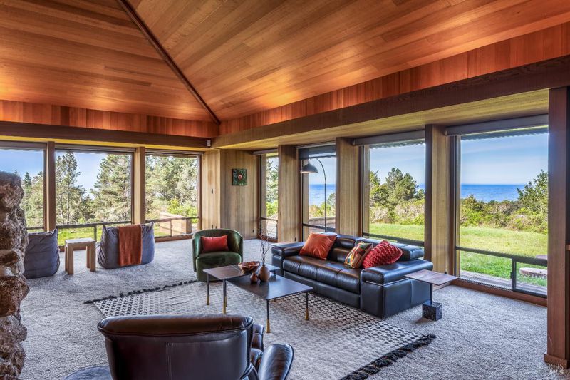 A rare and distinctive early Sea Ranch residence set on 1.17 acres, bordering on commons and capturing sweeping, unobstructed, panoramic ocean views of Black Point and the Pacific Ocean. Privately nestled within a serene natural landscape, this elegant one-story home embodies the essence of coastal living at The Sea Ranch. Designed in 1970 by noted architect Carson Bowler, the home showcases timeless design and thoughtful craftsmanship. The use of clear-heart redwood inside and out enhances the warmth of the property. The expansive open-concept living, dining, and kitchen area is ideal for entertaining, anchored by a dramatic stone fireplace and framed by floor-to-ceiling windows that invite the outdoors in. A generous ocean-facing deck provides a front-row seat for whale migrations and breathtaking sunsets, while a second, more sheltered deck offers the perfect setting for outdoor dining, container gardening, a hot tub perhaps and gatherings. The home features two spacious bedroom suites, each with its own en-suite bath and walk-in closet, offering both privacy and stunning ocean vistas. Recent updates include new carpet and tile throughout, as well as beautifully remodeled bathrooms with mahogany vanity completed by the owner/architect all with permits. Additional highlights include abundant storage, a walk-in pantry, a separate laundry room with new washer/dryer, and an attached three-car garage. The kitchen is enhanced with a new cooktop, dishwasher, built-in refrigerator, and under-counter lighting. Radiant heated slab floors and new insulated glass windows ensure year-round comfort. This is a truly special offering - an iconic Sea Ranch home where architecture, nature, and tranquility come together in perfect harmony.
