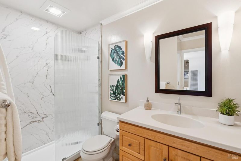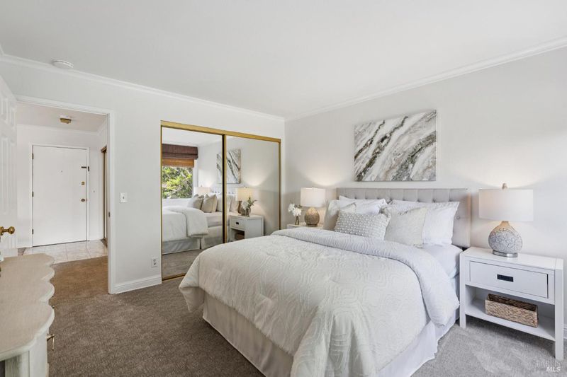Set in the quiet hills of Sausalito's Nevada Valley, this updated condo at The Roc offers a peaceful retreat with peekaboo bay views and tree-lined surroundings. The unit features new paint, carpet, stove, and a remodeled walk-in shower, plus crown molding throughout and generous closet spaceincluding an extra storage closet in the garage. The private deck and bedroom overlook trees lit with evening spotlights, creating a warm and calming ambiance. Includes one garage parking space with a commercial-grade bike rack. The condo has been lovingly owned for over 20 years. The Roc is known for its heated pool with stunning Mt. Tam views, two elevators, and expansive water views from the entrance. Located just 4 miles from the Golden Gate Bridge and 2 miles from the ferry, the neighborhood offers easy access to trails, houseboats, Remington Dog Park, MLK Park, and top local spots like Mollie Stone's, Bay Model, Fish, and Le Garage. Ideal for those seeking a quiet, community-oriented setting with quick access to Southern Marin's best.