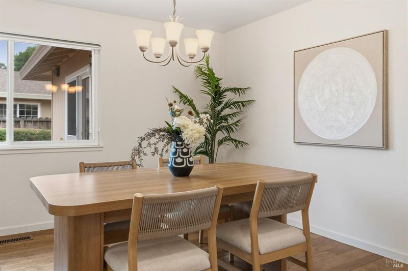 Located on a quiet corner lot in the highly sought-after Sherwood Forest neighborhood, this inviting single-level home offers comfort, character, and exceptional outdoor space. Engineered hardwood floors run through the main living areas and bedrooms, creating a cohesive and welcoming feel throughout. The living room is anchored by a classic stone fireplace, adding warmth and charm, while large windows bring in abundant natural light. The kitchen and dining area offer a functional layout with easy access to the backyard, ideal for everyday living or casual entertaining. The primary bedroom features a walk-in closet and a private, peaceful retreat. Both bathrooms are well maintained and thoughtfully positioned for convenience. Step outside to the generous backyard, which provides ample room to garden, relax, or entertain, with a corner lot setting that enhances privacy and usability. Set within an established neighborhood known for its tree-lined streets and close proximity to parks, shopping, dining, and everyday amenities and medical services, this home presents an excellent opportunity to enjoy one of Santa Rosa's most beloved communities.