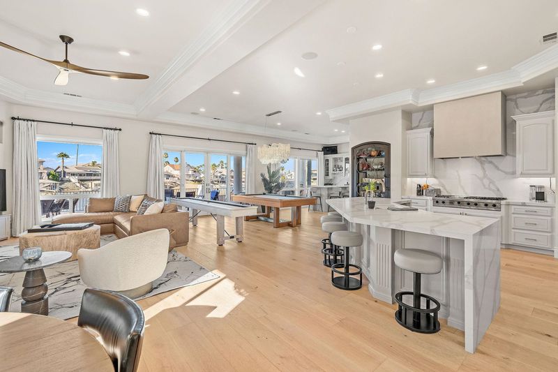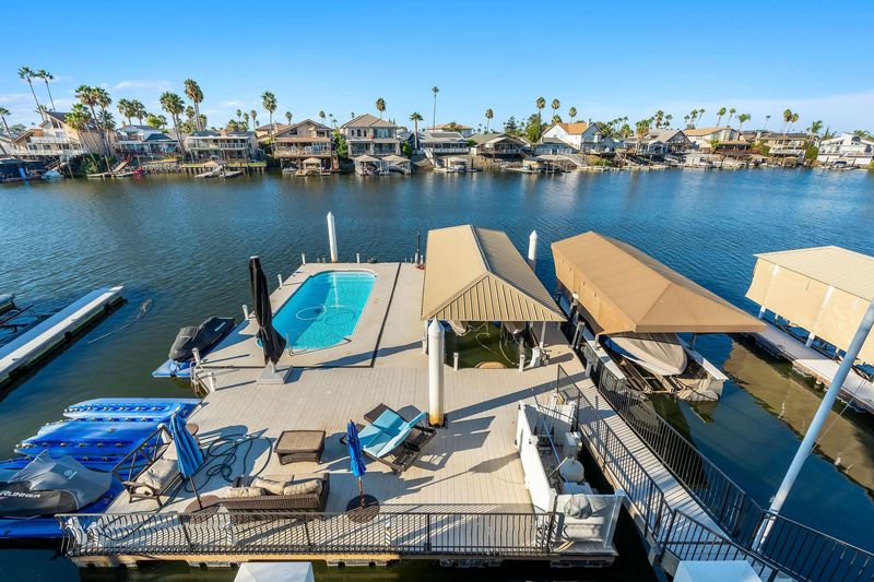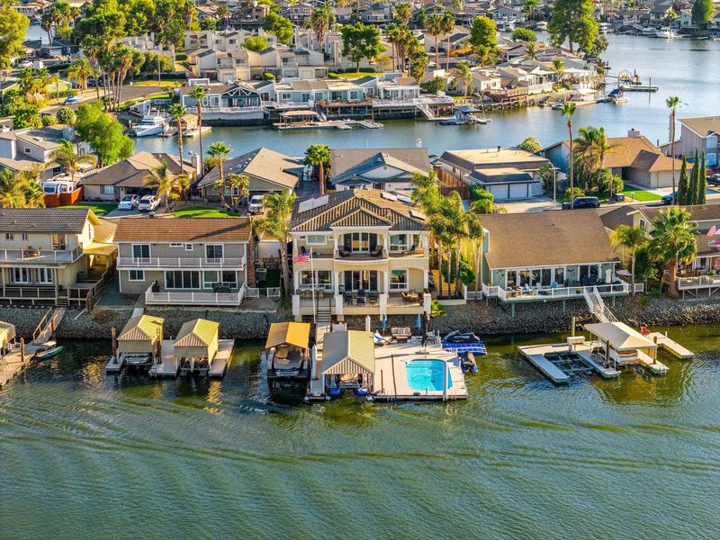 Nestled on a wide, serene bay, this spectacular Discovery Bay home offers unparalleled waterfront living! Gorgeous staircase and custom lighting give a captivating first impression! The spacious, airy great room provides formal dining, along with island seating for entertaining! Large windows maximize views whether you are enjoying the chef's kitchen or seated around the fireplace. The meticulously crafted kitchen offers comfort, sophistication & ease! Walk-in pantry, deep sink, wide Viking stovetop- attention to detail is evident throughout. Custom bar overlooks the water and sliders lead to expansive deck & dock, melding the indoors with outdoor living. Covered deck has a kitchen + a seating area that overlooks double U dock with sparkling pool. One ensuite bedroom on main floor, or use the elevator to reach 4 more ensuite bedrooms. The primary suite is a true retreat, providing lavish amenities like delta views from the balcony, a seating or office area, fireplace, wet bar & wine fridge. Spa-like bath completes this luxury space w/deep, jetted tub + walk-in closet outfitted with beautiful built-ins. The three car garage boasts LOADS of storage w/ cabinets & extended space. Owned solar provides monthly savings, making this luxury estate smart, as well as beautiful! See it soon!