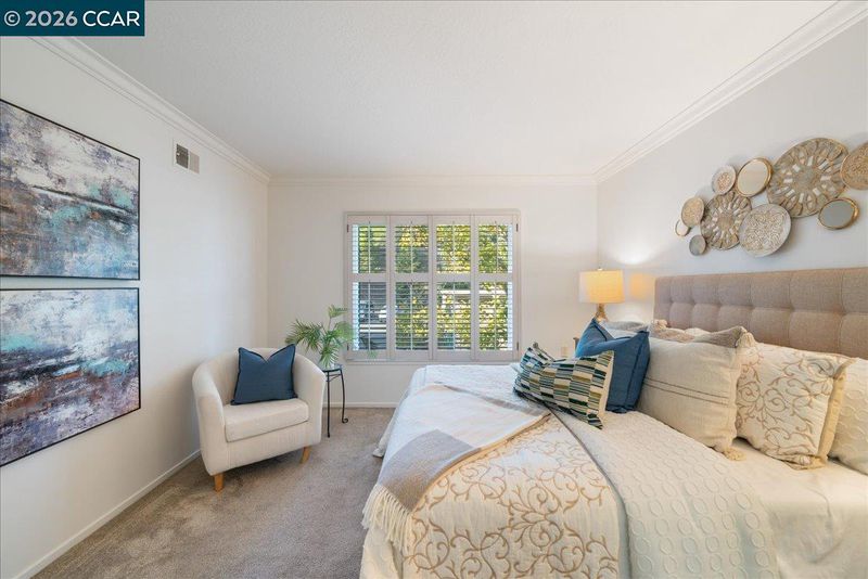 Sophisticated Sequoia 2/1 co-op with stylish updates and a remodeled kitchen and bath! Peaceful hill and tree views from the open balcony. Features include solid wood doors, dual pane windows and slider, plantation shutters, smooth ceilings, stacked laundry, step-in shower, crown molding, mirrored closet doors, LVP flooring in entry, kitchen & bath, updated cabinetry with soft close drawers and pull out shelves, finished kitchen skylight, plus lots of storage. Close to carport.