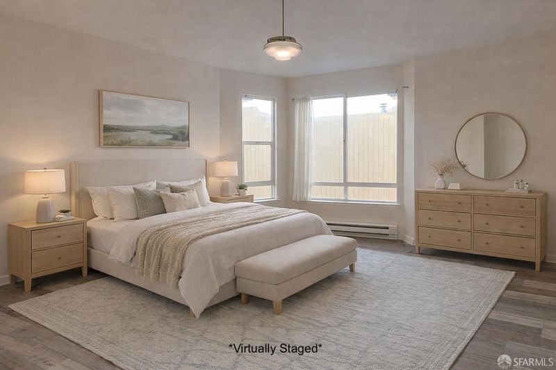 Gorgeous Top floor 2 bedrooms/2 baths, and a great open floor plan. Built in 1998 with no rent control. It features high ceilings, hardwood floors, double-paned windows, galley kitchen, gas stove, fridge, microwave & dishwasher. 1 assigned parking space - one in garage with storage area & one carport. Conveniently located close to shop, supermarket and public transportation. Easy freeway access.