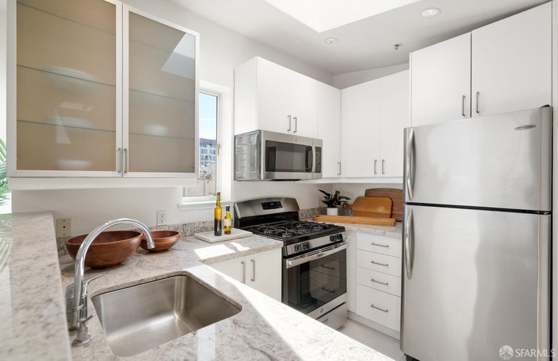 2315 Van Ness, No. 7 is a beautiful, top-floor condominium in a boutique 8-unit building. The residence includes two bedrooms and one-and-a-half bathrooms across 980 square feet of living space. The home offers a full span Golden Gate Bridge view from the primary bedroom, an open-plan living and dining area, a gourmet kitchen with stainless steel appliances and bar seating, in-unit washer and dryer, large private roof deck, and built-in closets.