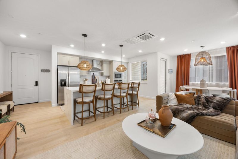 Experience refined modern living in this stunning, like-new condo built in 2022 and meticulously maintained. Offering 1,313 sq ft of thoughtfully designed space, this 2-bedroom, 2-bath residence showcases an open-concept layout filled with natural light and exquisite finishes throughout. The chef’s kitchen serves as the heart of the home, featuring sleek quartz countertops, contemporary cabinetry, premium appliances, and ample workspace—ideal for both everyday living and entertaining. The living and dining areas flow seamlessly, creating a sophisticated yet inviting atmosphere. The spacious primary suite is a true retreat, complete with a spa-inspired en-suite bath highlighted by a luxurious walk-in shower and designer finishes. A well-appointed secondary bedroom and bath provide flexibility for guests, a home office, or additional living space. Additional highlights include in-unit laundry for added convenience and owned solar, offering energy efficiency and long-term savings. Every detail reflects quality craftsmanship and modern elegance. Ideally located near Santana Row, Downtown San Jose, premier dining, shopping, entertainment, and major commuter routes, this exceptional condo offers the perfect blend of luxury, lifestyle, and location—an opportunity not to be missed.