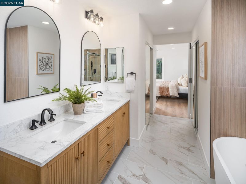 - Shower Over Tub, Stall Shower, Tile, Updated Baths, Double Vanity, Stone, Window