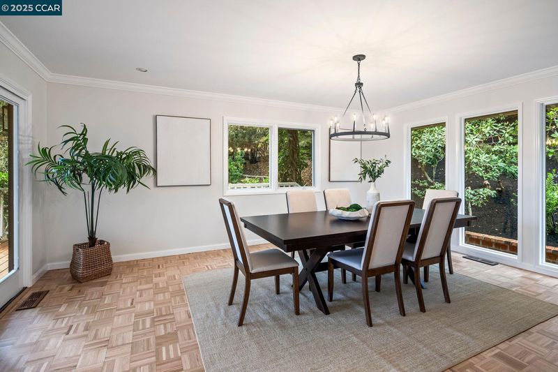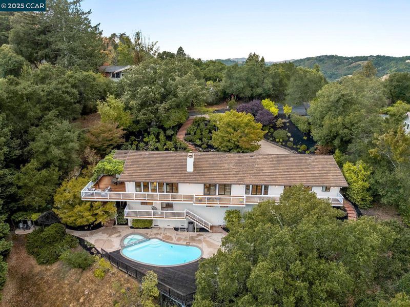 This home sits on a private cul-de-sac amidst nature. A brick stairway meanders down through the immaculate garden to the home’s spacious foyer. It leads to the 300-sq-ft living room, with a paneled ceiling above, parquet hardwoods below, wood-burning fireplace and deck access. Move for dinner to the spacious dining room, with views on 3 sides. The well-appointed kitchen sits alongside, with elite appliances, granite counters, extraordinary garden views through oversized windows, a skylight and oak hardwoods. The principal suite and another large bedroom also are on the main floor, each with an en-suite bath. Both have ample closets; the principal suite has 2. The other bedrooms are downstairs, along with a 450-sq-ft family/rec room (with fireplace). That room leads outside to a deck and down to the swimming pool (resurfaced in 2020), and the adjacent bathroom and outdoor shower. Work or study in the spacious office on the main floor, with deck access and views of surrounding trees. Parking is easy in the 3-car garage and on the cul-de-sac above. For safety, the home’s roof was replaced in 2012 with Eaglelite Ponderosa concrete tiles, and the fully equipped fire station is just down the hill. So, too, are Lafayette’s restaurants and shopping, just minutes away.