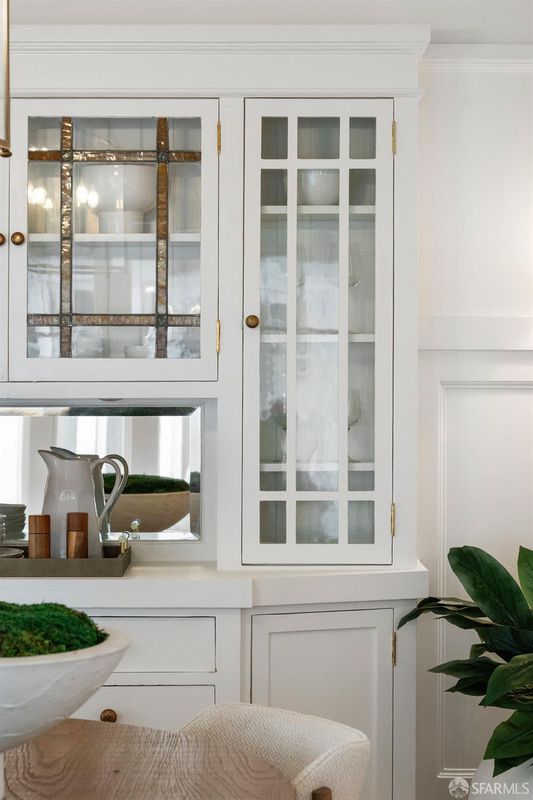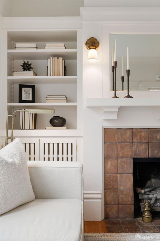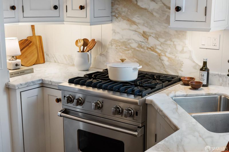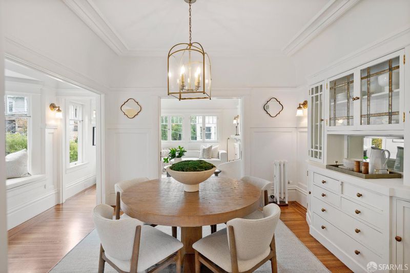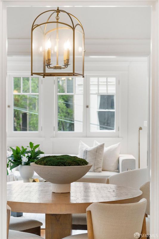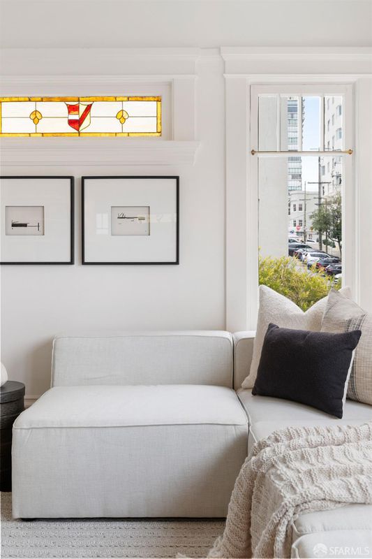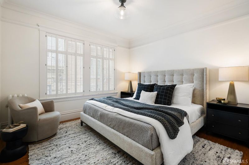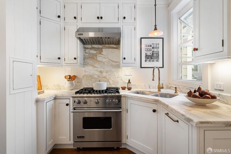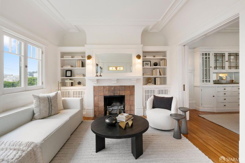 Quintessential San Francisco! This character-filled Edwardian condo with an abundance of preserved period details is situated in a boutique 6-unit building just block from the cable car line, with views to Sutro Tower and a shared roof deck w/sweeping views of the Golden Gate Bridge and the bay. The front of the home hosts a formal living room w/ fireplace & stained glass window, formal dining room w/built-in china cabinet & bay-window seat, and a high-end kitchen adorned with rare Calacatta gold marble counters, a Viking professional gas range + second oven, and a Miele built-in refrigerator & dishwasher. Two peaceful bedrooms w/ample closets lie across the back of the home. The renovated bath features a basketweave tile floor, a luxurious soaking tub w/shower, built-in cabinetry, and a marble-topped vanity. Additional features include in-unit laundry, a spacious hallway closet, and a private storage room in the basement. Surrounded by world-class dining, shops and amenities.